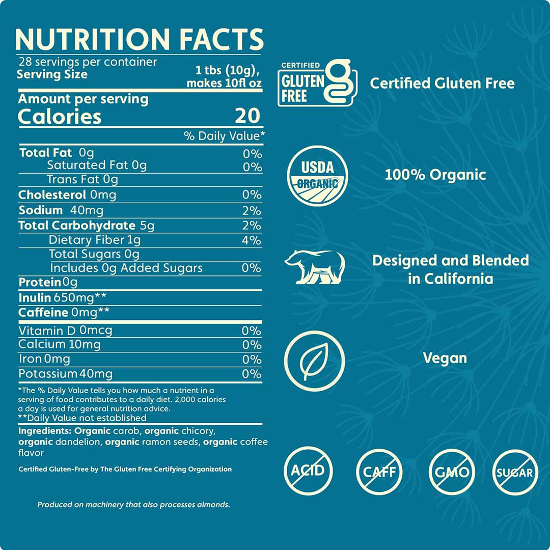 Intense deep coffee notes from roasted ramón seeds, dandelion and chicory roots; unsweetened
