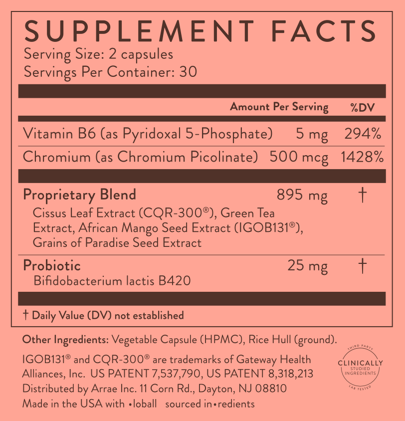 Vitamin B6 (as Pyridoxal 5-Phosphate 68%) – 5mg, Chromium (as Chromium Picolinate) – 500mcg, Green Tea Extract, African Mango Seed Extract (IGOB131®), Cissus Leaf Extract (CQR-300®), Grains of Paradise Seed Extract – 895mg, Probiotic: Bifidobacterium lactis B420 – 25mg